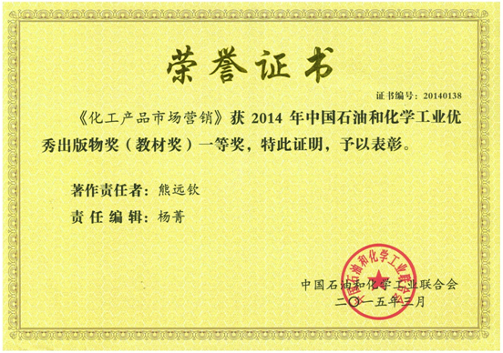 近日,中国石油和化学工业联合会举办的优秀出版物奖(图书奖、教材奖)评审结果揭晓,opta足球熊远钦老师主编的教材《化工产品市场营销》获2014年度中国石油和化学工业联合会优秀出版物奖(教材奖)一等奖。