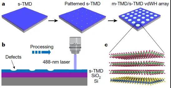 该研究成果开发了用激光烧蚀等技术在二维半导体原子晶体基底上定点制造缺陷阵列,金属纳米片在这些缺陷点成核能垒低,优先成核。控制超薄金属的生长条件,最终形成可控的超薄材料/原子级厚度半导体异质结阵列。这种策略适用于各种不同材料,不限于特定化学组成或晶格结构。作为演示,研究人员利用原子精确的,接近理想的范德华界面制造出各种二维范德华异质结,包括VSe2/WSe2,NiTe2 / WSe2,CoTe2/ WSe2,NbTe2 / WSe2,VS2 / WSe2,VSe2/ MoS2和VSe2 / WS2。生长在二维半导体上的二维金属性过渡金属硫化物均具有可设计的周期性排列特点和可在指定区域进行调控的横向尺寸,最终可以晶体管的沟道尺寸和调节电路的形态。